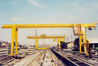 用于船臺拼裝船體,常備有兩臺起重小車:一臺有兩個主鉤,在橋架上翼緣的軌道上運行;另一臺有一個主鉤和一個副鉤,在橋架下翼緣的軌道上運行,以便翻轉和吊裝大型的船體分段。起重量一般為100~1500噸;跨度達185米;起升速度為2~15米/分,還有0.1~0.5米/分的微動速度。